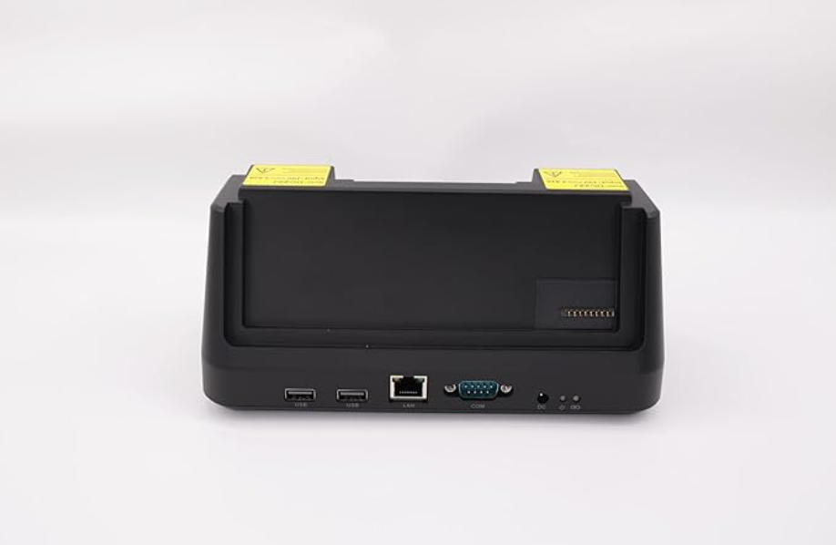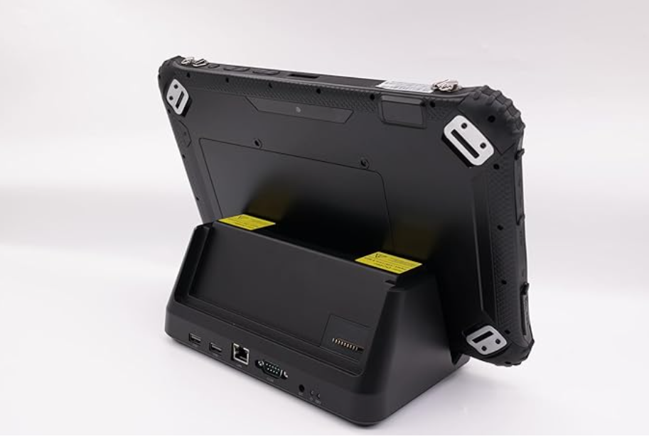 Place the Rugged Tablet in the Docking Station, and attach the power supply to the back of the Docking Station to charge the tablet.