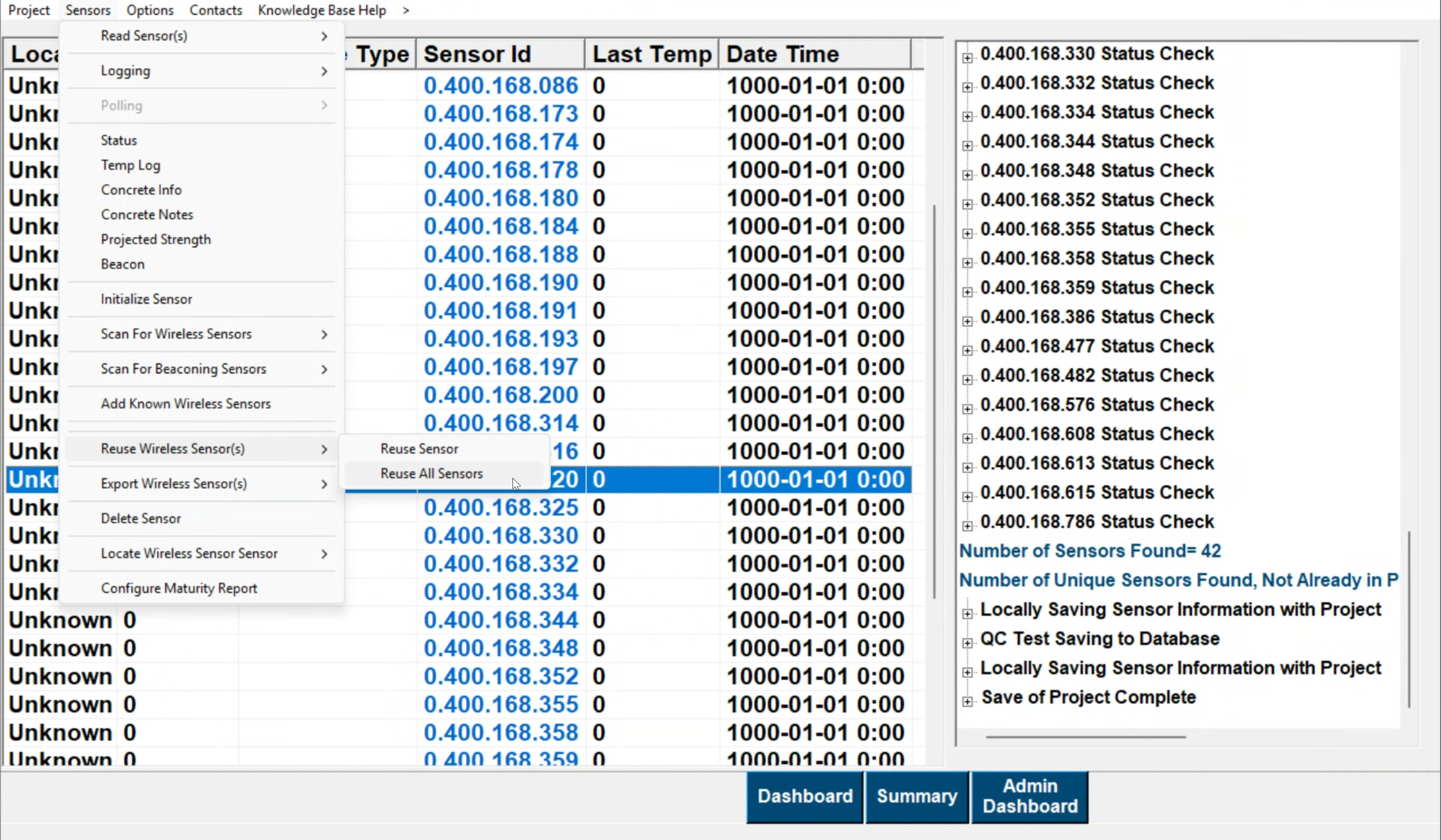 After you have the exact Wireless Loggers in your Project that you would like to use for your new placement, click on Sensors, Reuse Wireless Sensor(s), Reuse All Sensors