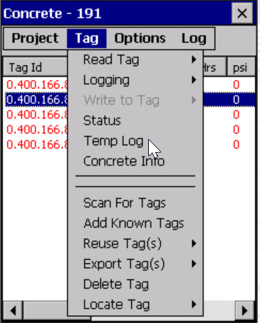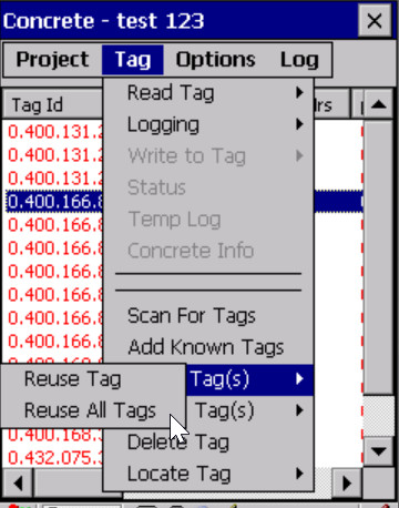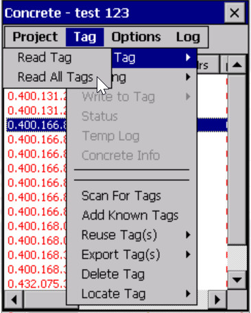 7) To Read the Temperature from the Loggers at any time, click on Tag, Read Tag, Read All Tags