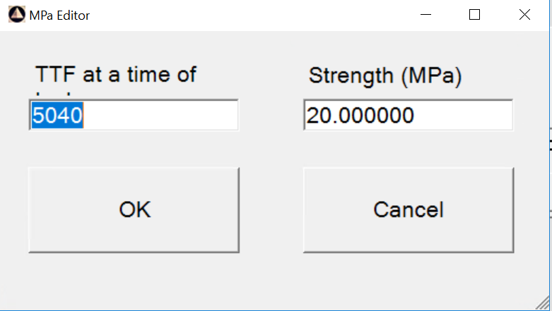 Double-tap on the second row of the Test Results list. Once again, the editor pops up. The TTF for the 28-day strength will be 20160 (28 days X 24 hours X 30 Degrees Celsius). The strength will be 25 MPa. Tap on OK.