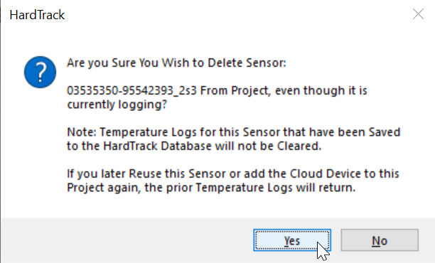 Click Yes to the question that asks if you want to delete a sensor that is already logging.