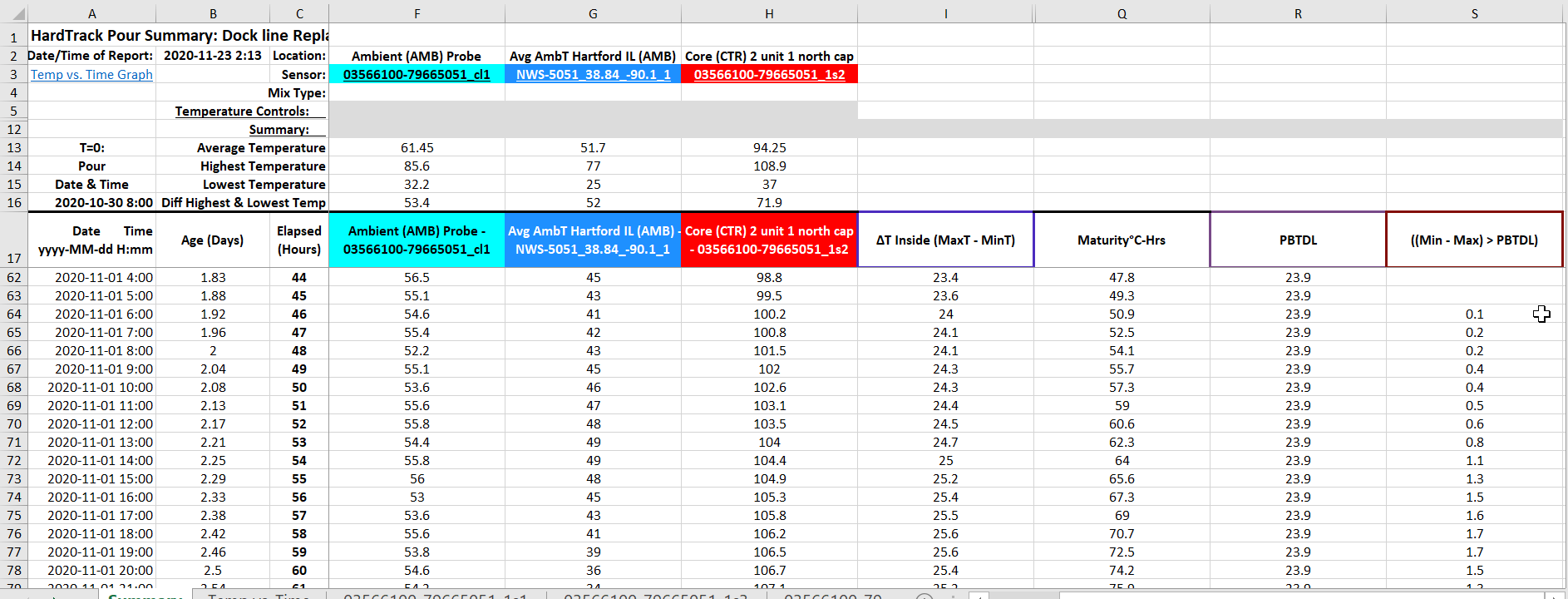 If any of the temperature difference calculations exceed the PBTDL, you will see values in the (Min - Max) > PBTDL column: