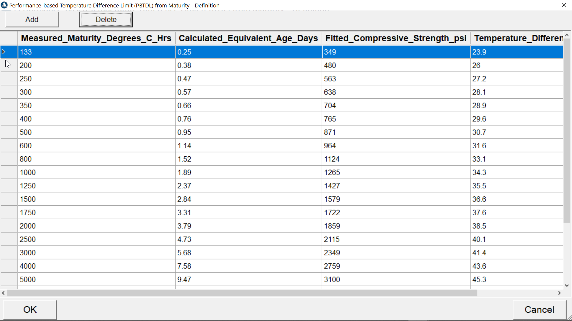HardTrack supports the use of Performance-based Temperature Difference Limit (PBTDL) for verifying if the temperature difference between sensors in the concrete is within the calculated temperature difference based upon a predefined table that HardTrack uses to lookup the appropriate temperature difference based upon the concrete maturity, for example, TTF