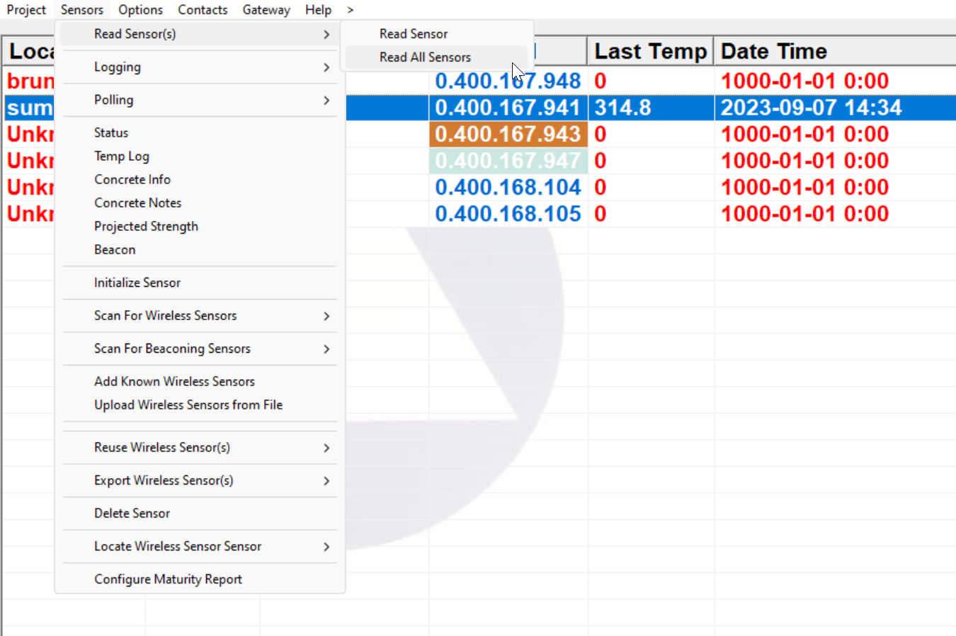 If you would like to read only a single sensor, highlight the sensor by single clicking on it, then click Sensors, Read Sensor(s), Read Sensor