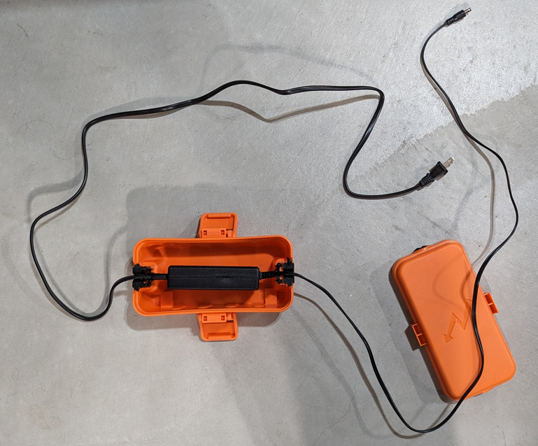 Remove the power cord from the waterproof enclosure,Although it is best to use the A/C charger indoors, Wake has supplied a waterproof enclosure for the A/C charger incase it is needed to charge a device in the field. Please be certain to place the lid on the waterproof enclosure and snap both latched down to secure that charger within the waterproof enclosure.position the input selector on the HTC Gateway or Sidecar to Off,insert the round 5.5mm tip into the device,