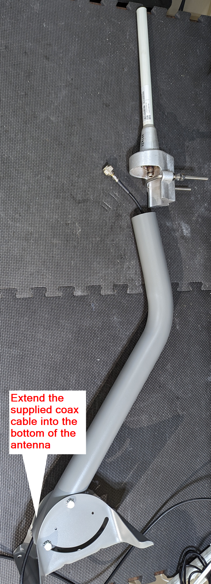 Extend the supplied coax cable into the bottom of the antenna mount so that is protrudes from the top of the mounting pipe. Firmly attach the coax cable to the antenna.