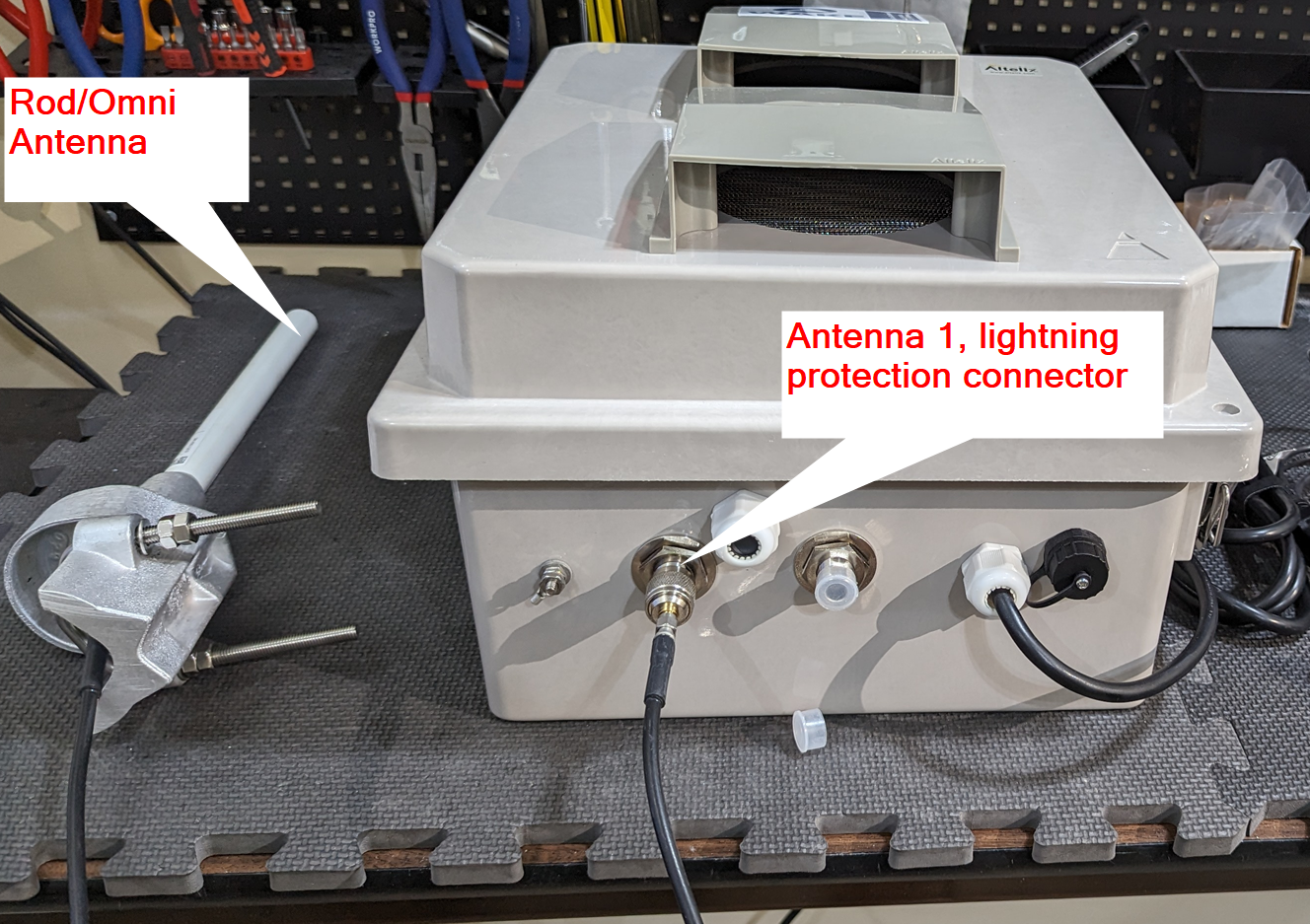 After firmly mounting the rod antenna with the provided lag bolt hardware, attach the supplied coax cable from the rod antenna to the left, antenna 1, lightning protector.